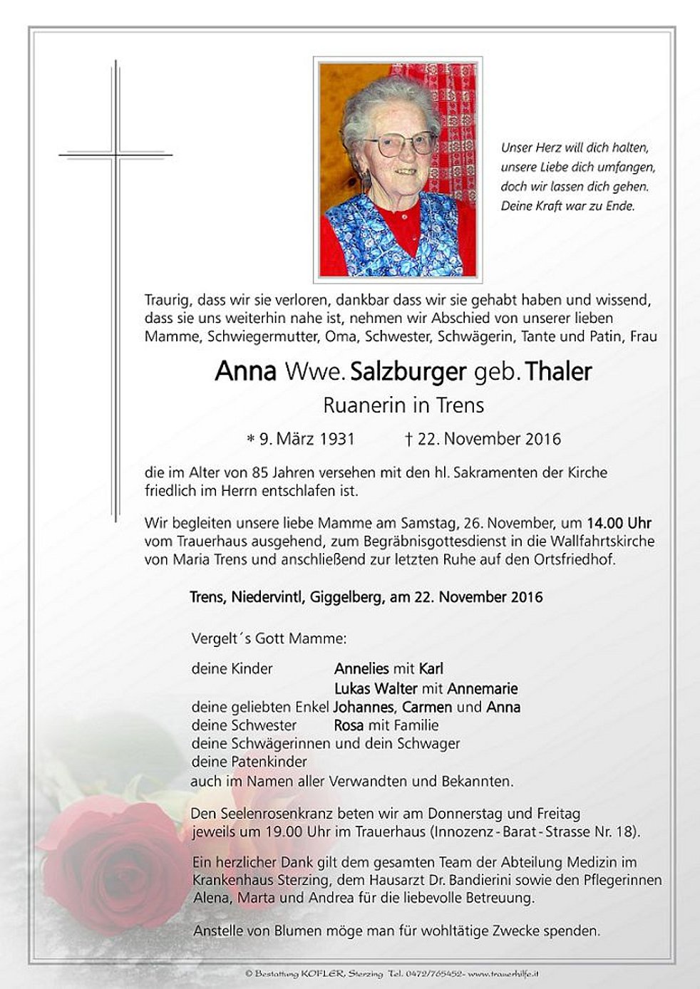 Wir begleiten unsere liebe Mamme am Samstag, 26. November, um 14.00 Uhr vom Trauerhaus ausgehend, zum Begräbnisgottesdienst in die Wallfahrtskirche von Maria Trens und anschließend zur letzten Ruhe auf den Ortsfriedhof.