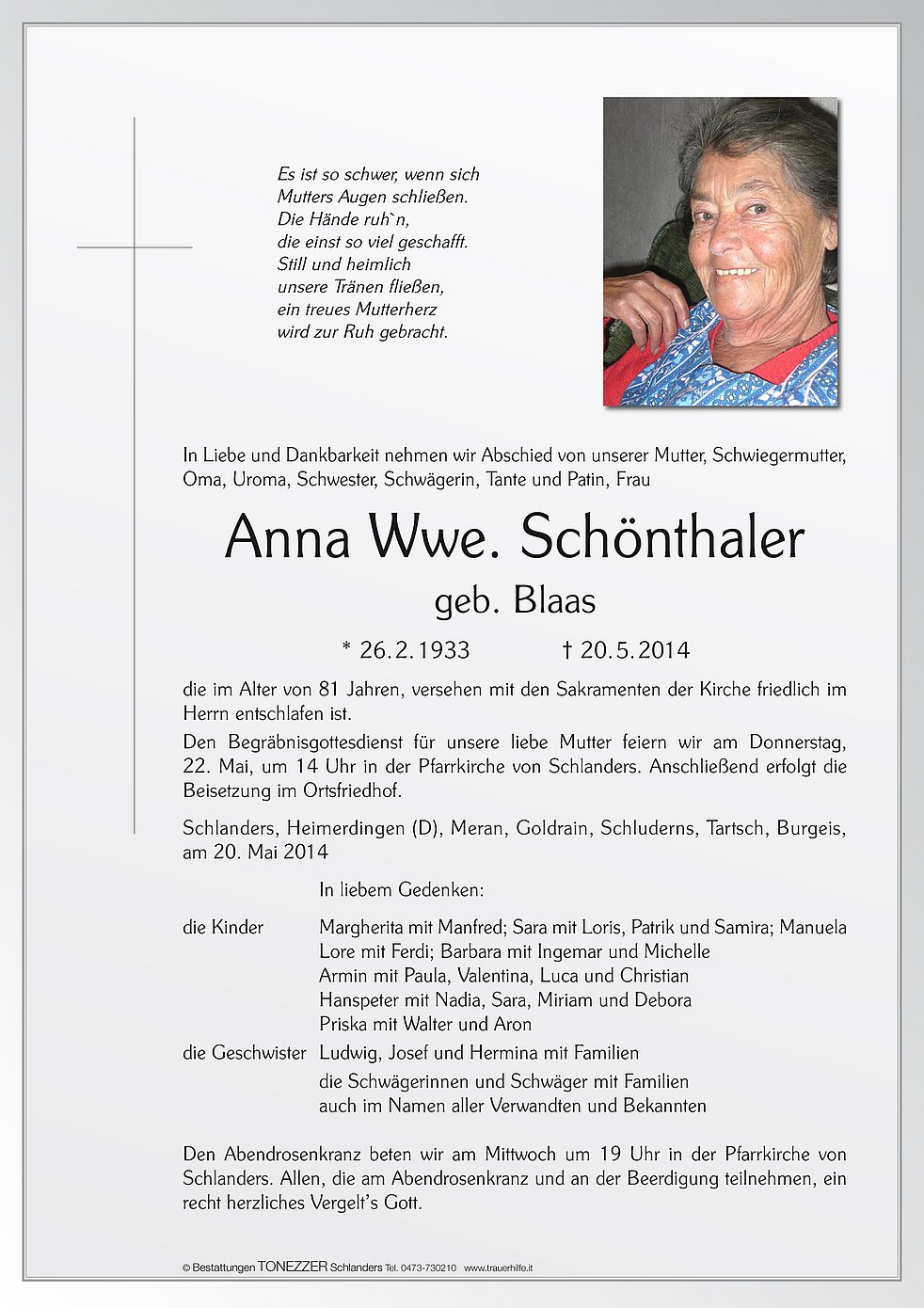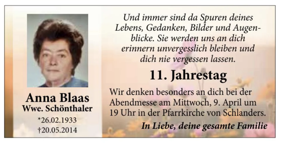 Den Begräbnisgottesdienst für unsere liebe Mutter feiern wir am Donnerstag, 22. Mai, um 14 Uhr in der Pfarrkirche von Schlanders. Anschließend erfolgt die Beisetzung im Ortsfriedhof.