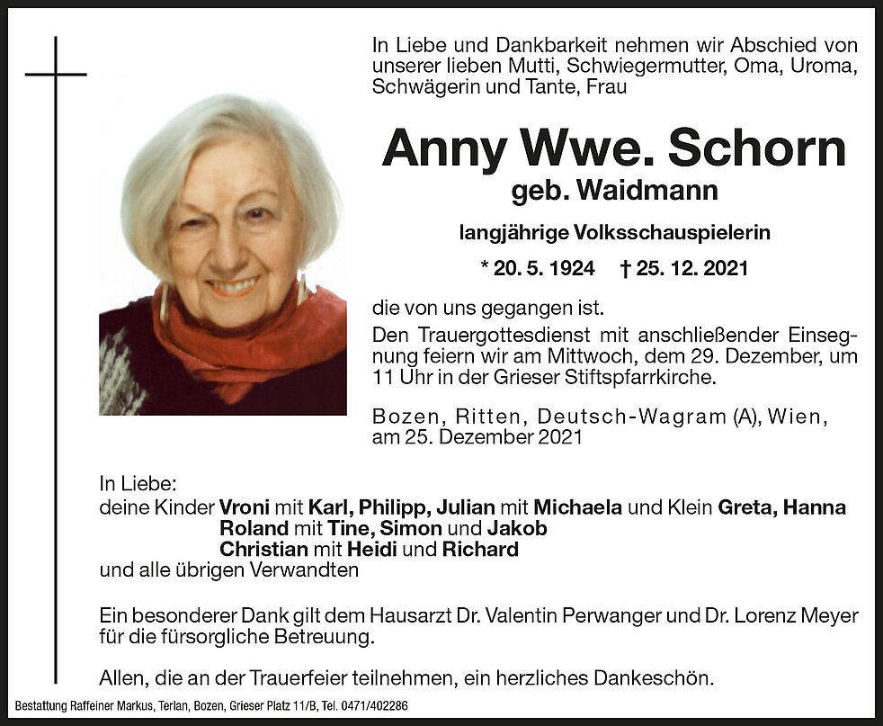 Den Trauergottesdienst mit anschließender Einsegnung feiern wir am Mittwoch, dem 29. Dezember, um 11 Uhr in der Grieser Stiftspfarrkirche.