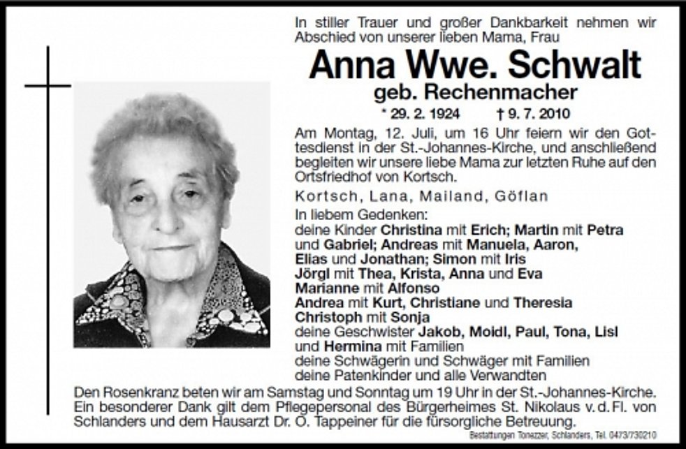Ein besonderer Dank gilt dem Pflegepersonal des Bürgerheimes St. Nikolaus v.d.Fl. von Schlanders und dem Hausarzt Dr. Oswald Tappeiner für die fürsorgliche Betreuung.