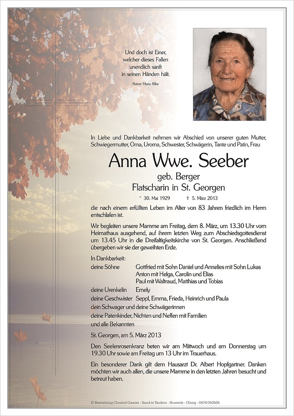 Wir begleiten unsere Mamme am Freitag, dem 8. März, um 13.30 Uhr vom Heimathaus ausgehend, auf ihrem letzten Weg zum Abschiedsgottesdienst um 13.45 Uhr in die Dreifaltigkeitskirche von St. Georgen. Anschließend übergeben wir sie der geweihten Erde.