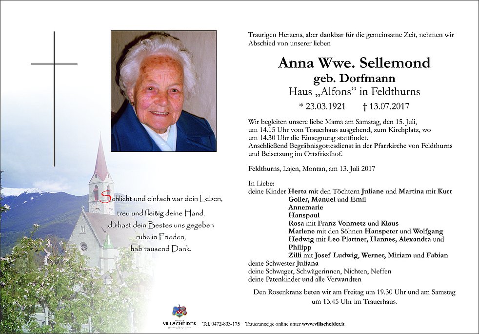Anschließend Begräbnisgottesdienst in der Pfarrkirche von Feldthurns und Beisetzung im Ortsfriedhof.