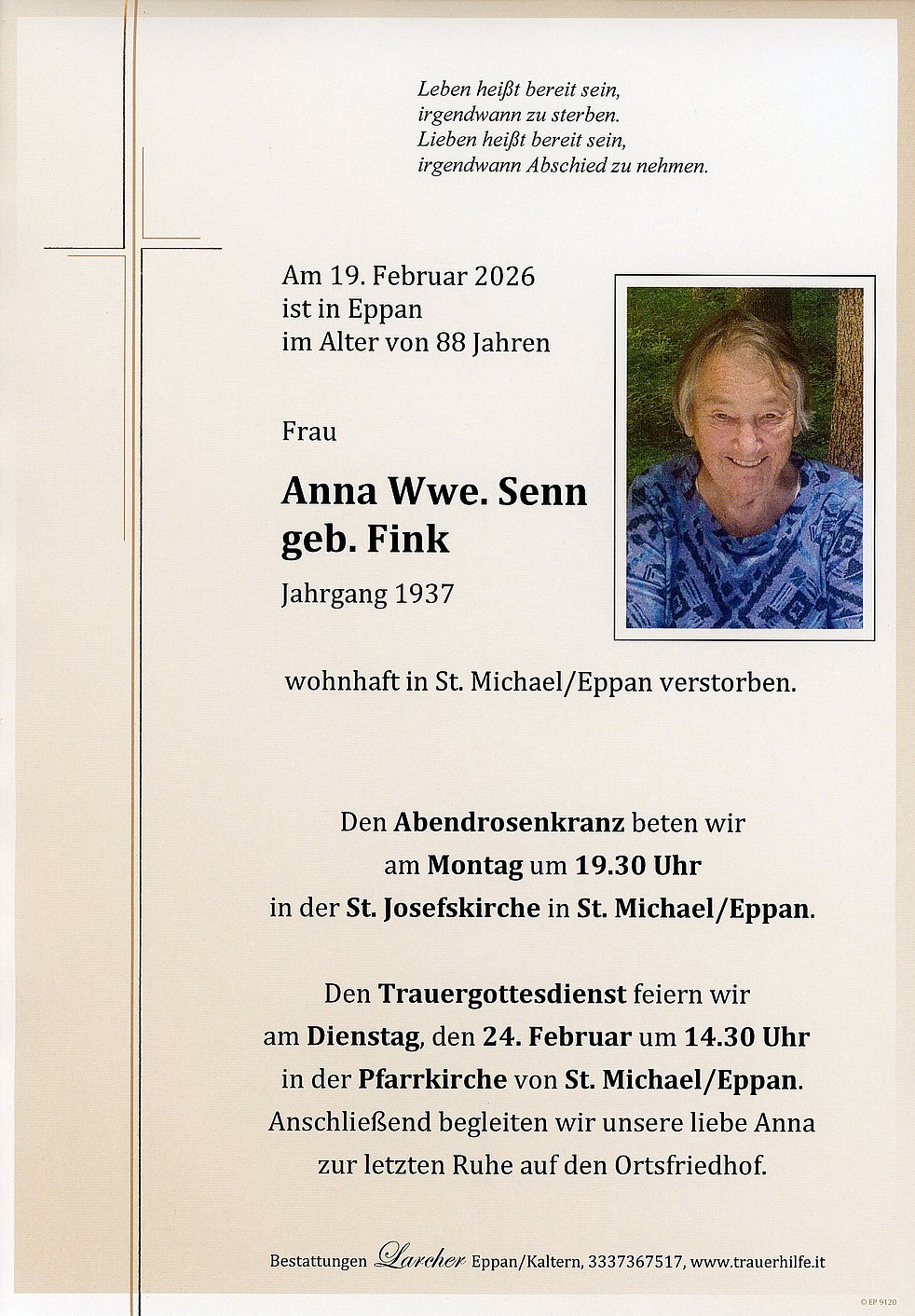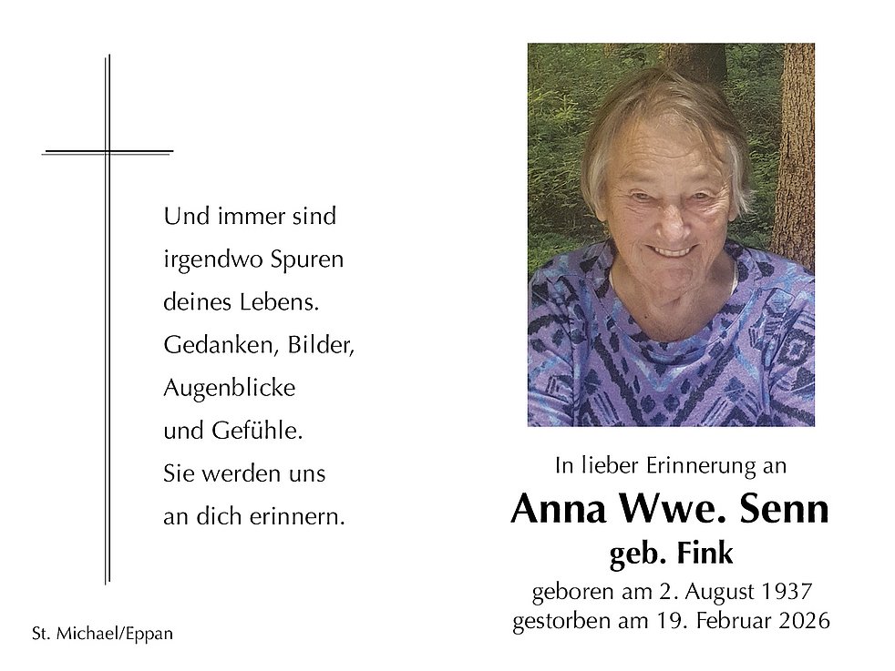Den Trauergottesdienst feiern wir am Dienstag, den 24. Februar um 14.30 Uhr in der Pfarrkirche von St. Michael/Eppan. Anschließend begleiten wir unsere liebe Verstorbene zur letzten Ruhe auf den Ortsfriedhof.