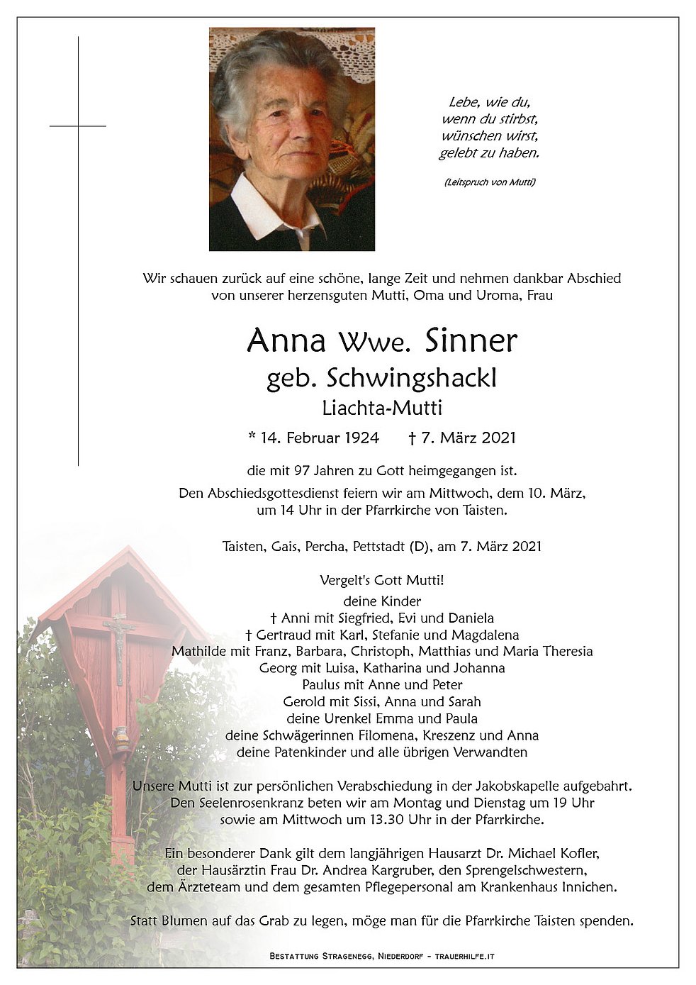 Statt Blumen auf das Grab zu legen, möge man für die Pfarrkirche Taisten spenden.