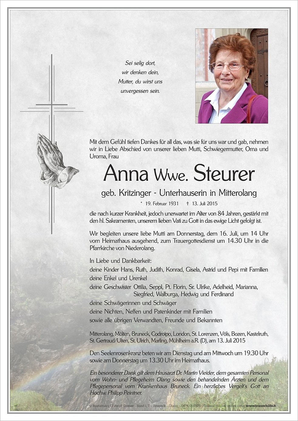 Wir begleiten unsere liebe Mutti am Donnerstag, dem 16. Juli, um 14 Uhr vom Heimathaus ausgehend, zum Trauergottesdienst um 14.30 Uhr in die Pfarrkirche von Niederolang.
