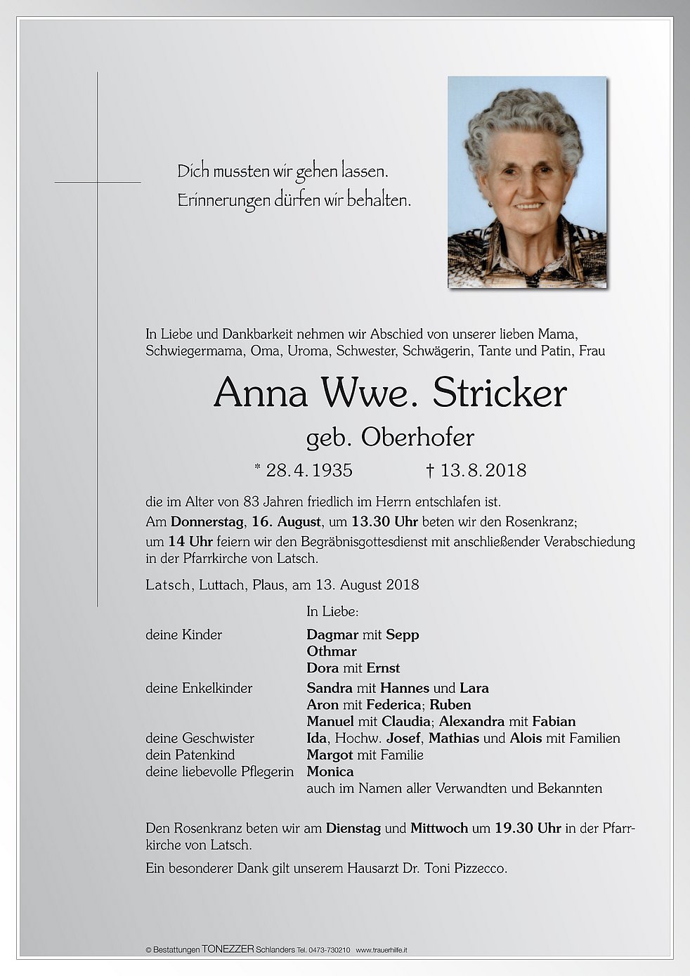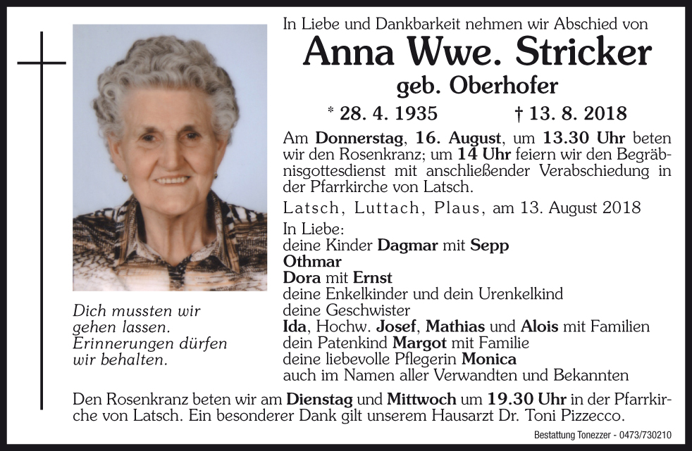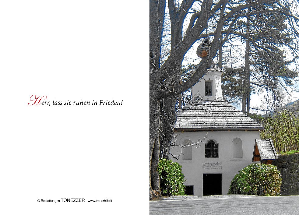 Am Donnerstag, 16. August, um 13.30 Uhr beten wir den Rosenkranz; um 14 Uhr feiern wir den Begräbnisgottesdienst mit anschließender Verabschiedung in der Pfarrkirche von Latsch.