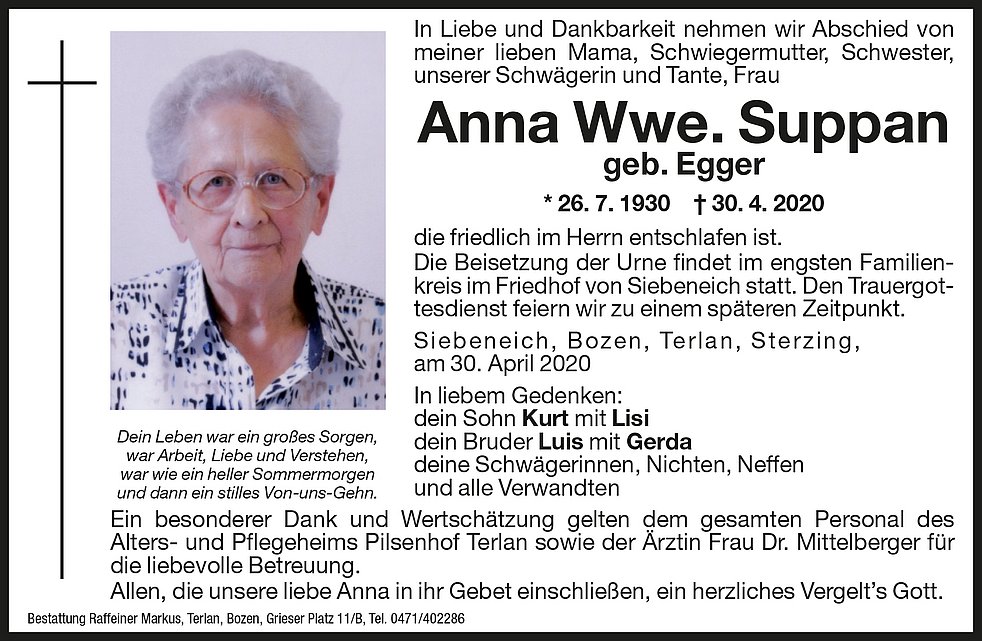 Ein besonderer Dank und Wertschätzung gelten dem gesamten Personal des Alters- und Pflegeheims Pilsenhof Terlan, sowie der Ärztin Frau Dr. Mittelberger für die liebevolle Betreuung.