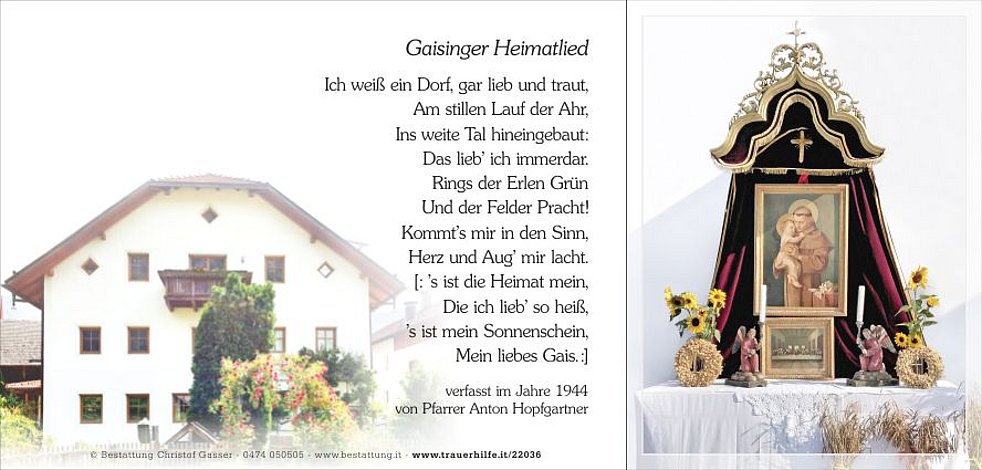 Ein herzlicher Dank gilt der Hausärztin Frau Dr. Simone Unterpertinger, den Sprengelschwestern, besonders Erika, und dem Hauspflegedienst für die liebevolle und fürsorgliche Betreuung.