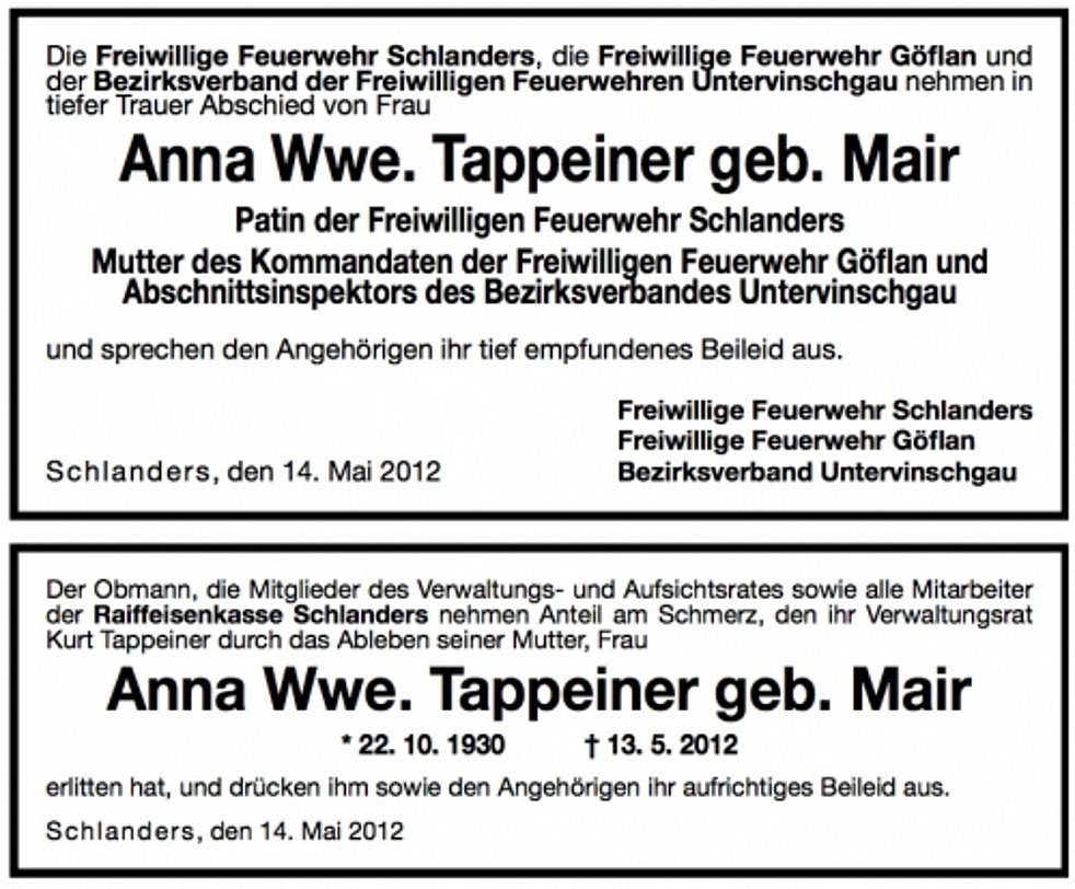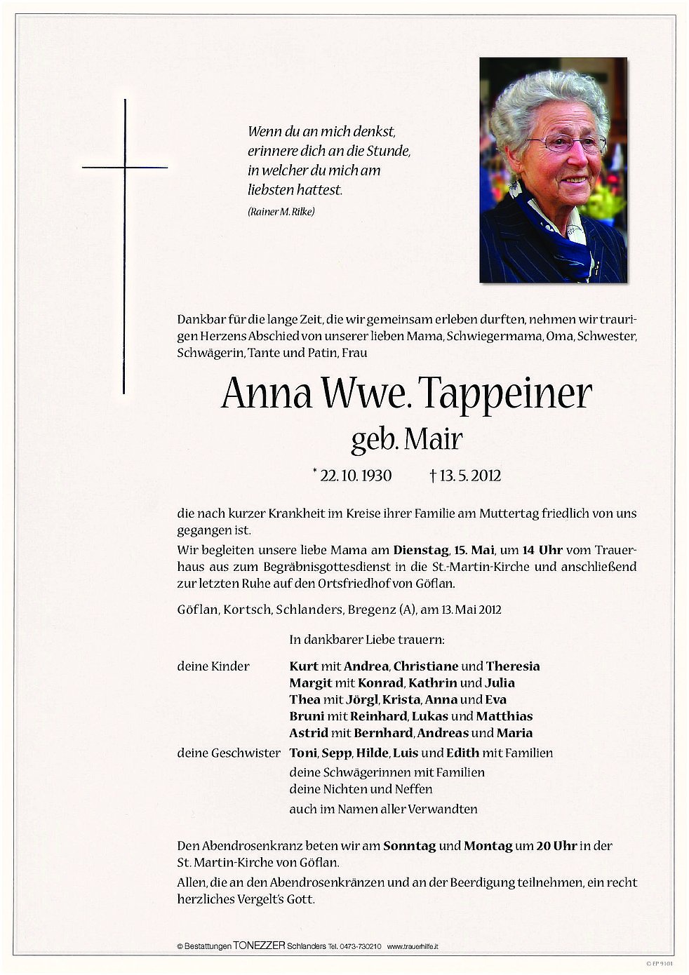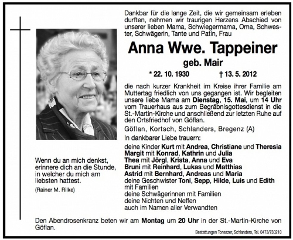 Wir begleiten unsere liebe Mama am Dienstag, 15. Mai, um 14 Uhr vom Trauerhaus aus zum Begräbnisgottesdienst in die St.-Martin-Kirche und anschließend zur letzten Ruhe auf den Ortsfriedhof von Göflan.