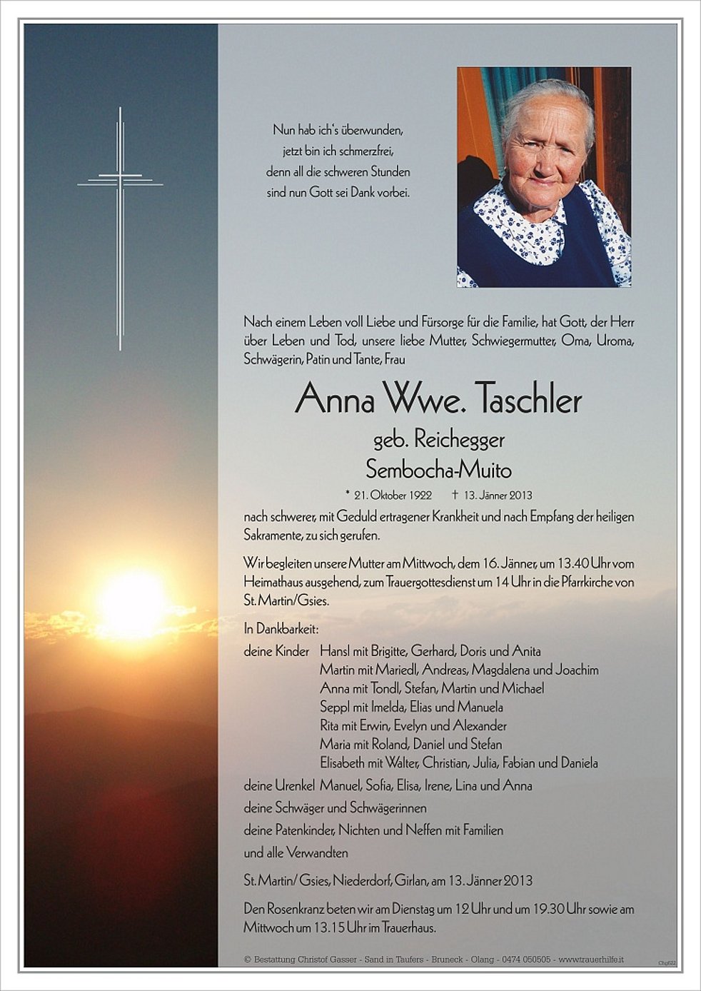 Wir begleiten unsere Mutter am Mittwoch, dem 16. Jänner, um 13.40 Uhr vom Heimathaus ausgehend, zum Trauergottesdienst um 14 Uhr in die Pfarrkirche von St. Martin/Gsies.