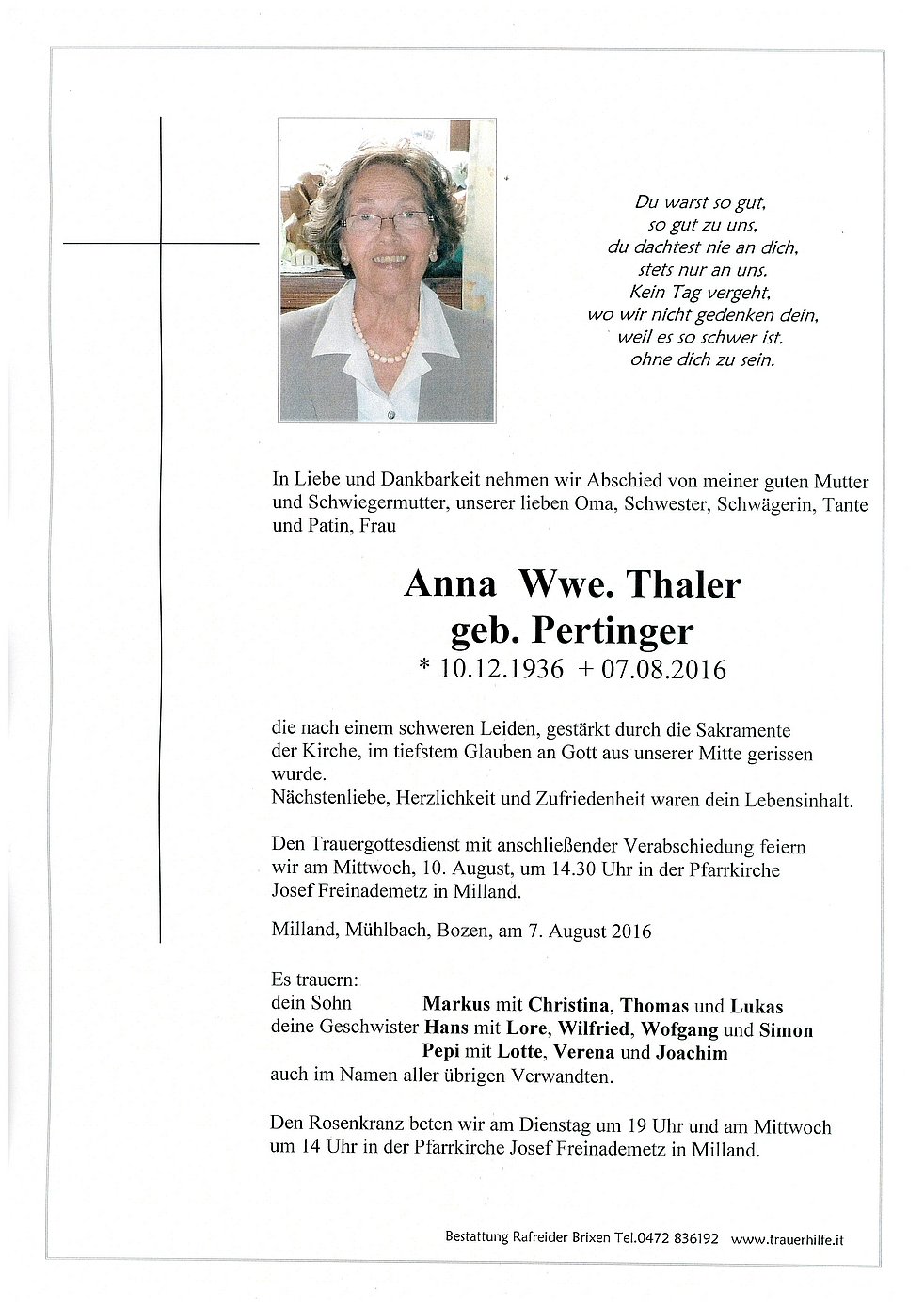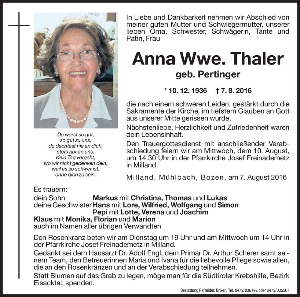 Anstatt Blumen auf das Grab zu legen, möge man für die Südt. Krebshilfe, Bezirk Eisacktal, spenden.