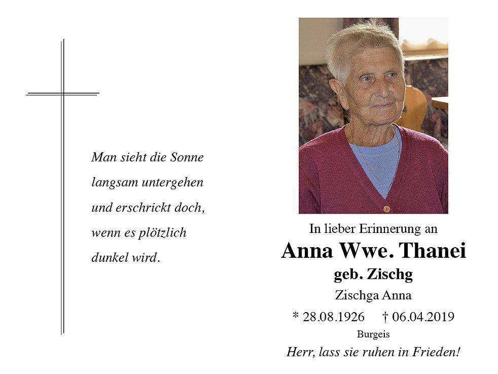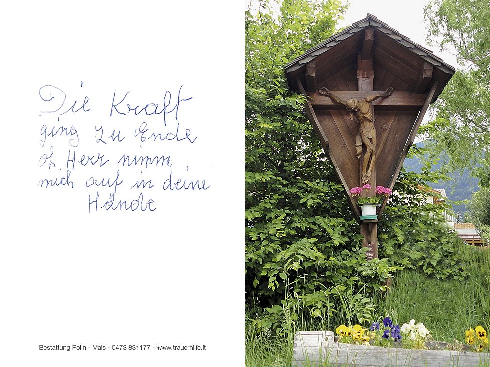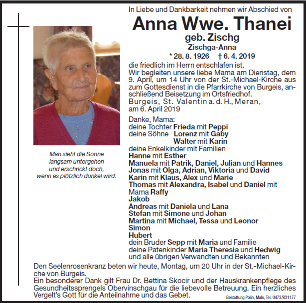 Wir begleiten unsere liebe Mama am Dienstag, den 09. April um 14.00 Uhr von der St. Michaels-Kirche aus zum Gottesdienst in die Pfarrkirche von Burgeis, anschließend Beisetzung im Ortsfriedhof