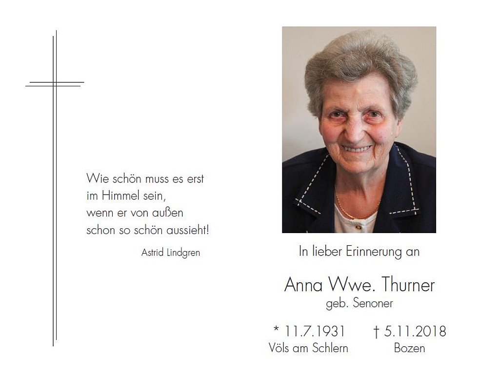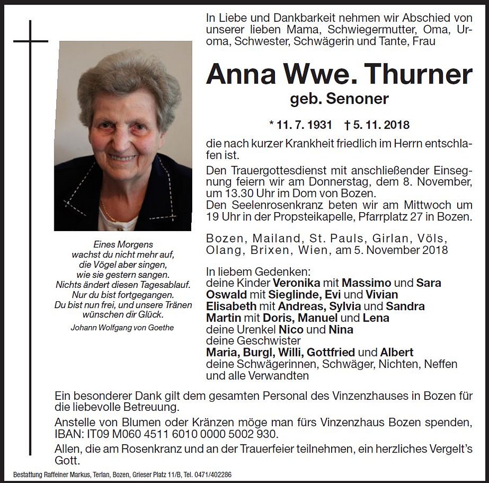 Anstelle von Blumen oder Kränzen möge man fürs Vinzenhaus Bozen spenden. IBAN: IT09M0604511601000005002930