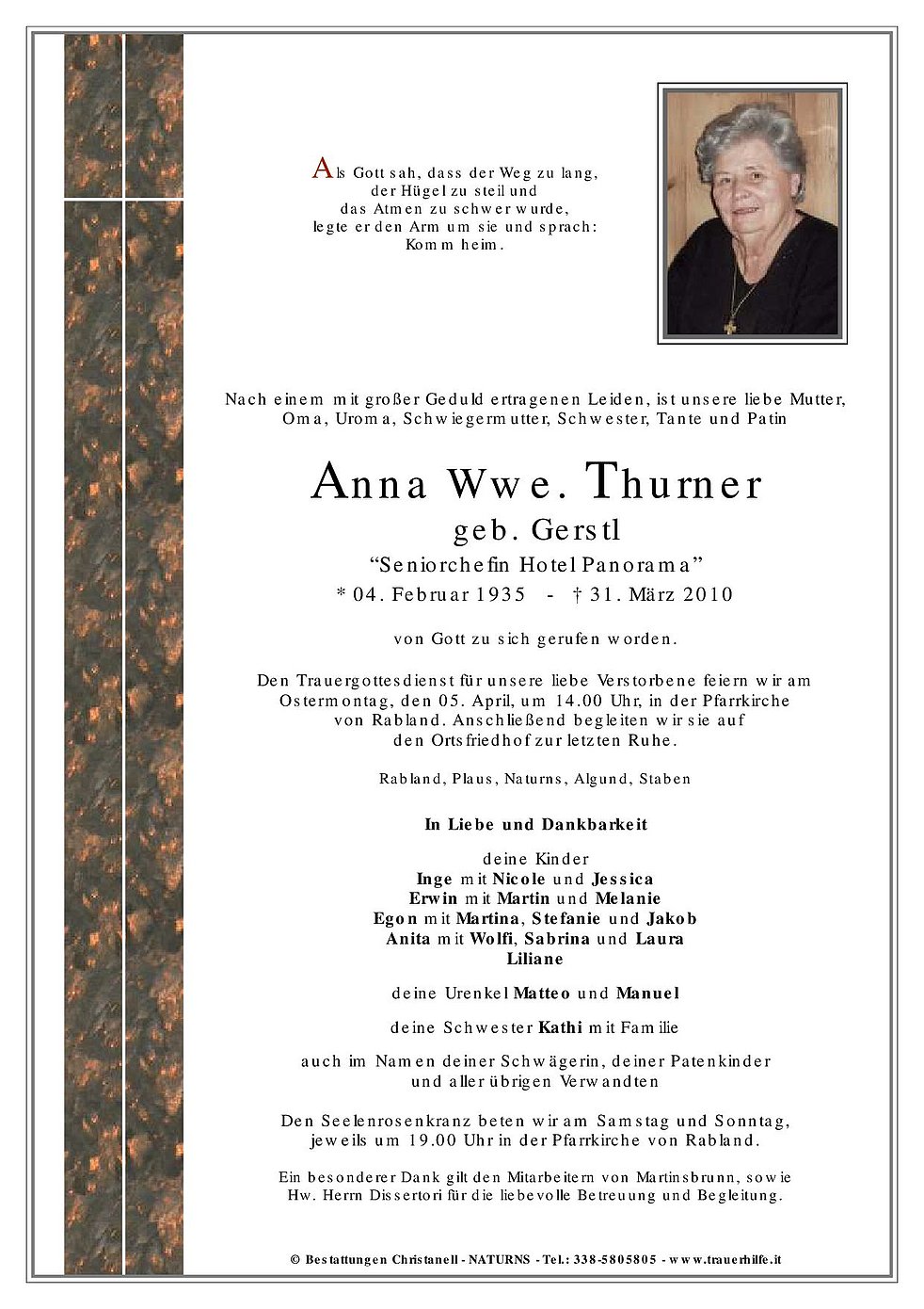 Den Trauergottesdienst für unsere liebe Verstorbene feiern wir am Ostermontag, den 05. April, um 14.00 Uhr, in der Pfarrkirche von Rabland. Anschließend begleiten wir sie auf den Ortsfriedhof zur letzten Ruhe.
