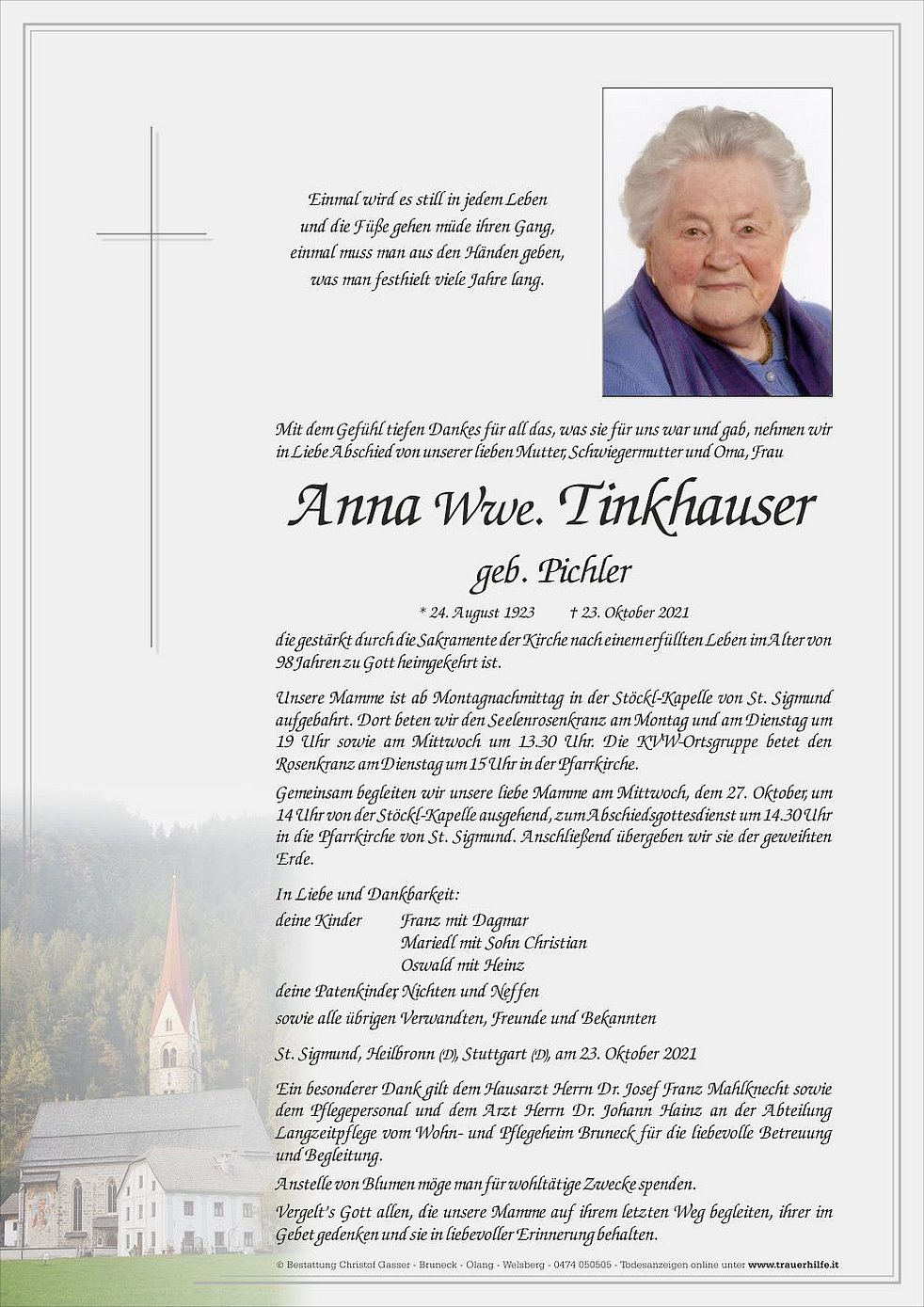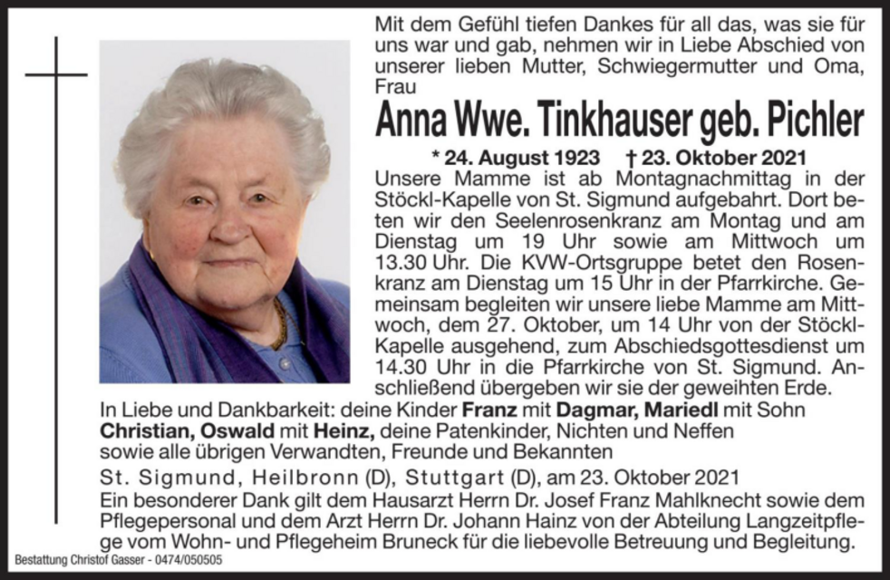 Gemeinsam begleiten wir unsere liebe Mamme am Mittwoch, dem 27. Oktober, um 14 Uhr von der Stöckl-Kapelle ausgehend, zum Abschiedsgottesdienst um 14.30 Uhr in die Pfarrkirche von St. Sigmund. Anschließend übergeben wir sie der geweihten Erde.