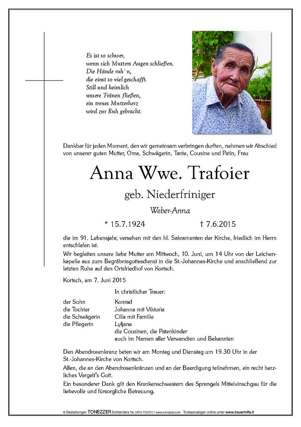 Wir begleiten unsere liebe Mutter am Mittwoch, 10. Juni, um 14 Uhr von der Leichenkapelle aus zum Begräbnisgottesdienst in die St.-Johannes-Kirche und anschließend zur letzten Ruhe auf den Ortsfriedhof von Kortsch.
