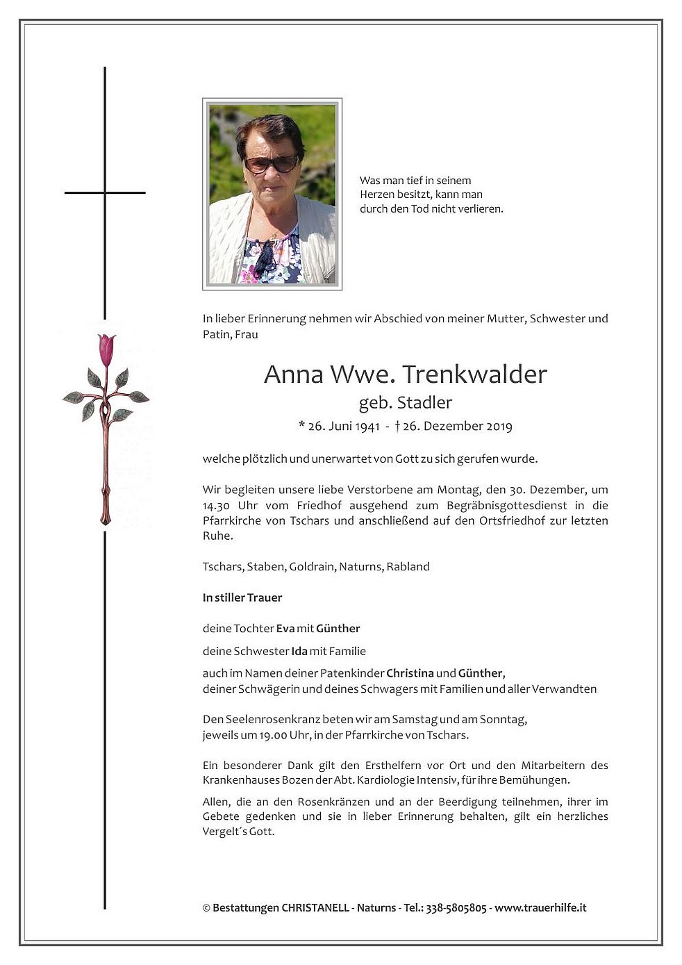 Wir begleiten unsere liebe Verstorbene am Montag, den 30. Dezember, um 14.30 Uhr vom Friedhof ausgehend zum Begräbnisgottesdienst in die Pfarrkirche von Tschars und anschließend auf den Ortsfriedhof zur letzten Ruhe.