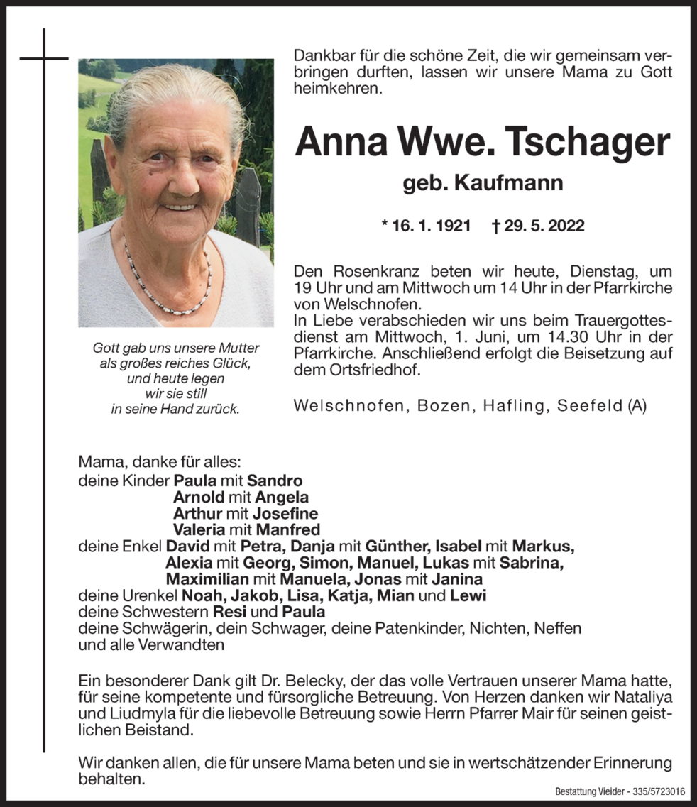 In Liebe verabschieden wir uns beim Trauergottesdienst am Mittwoch, 1. Juni, um 14.30 Uhr in der Pfarrkirche. Anschließend erfolgt die Beisetzung auf dem Ortsfriedhof.