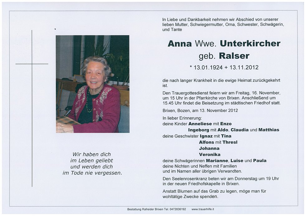 Den Trauergottesdienst feiern wir am Freitag, 16. November, um 15 Uhr in der Pfarrkirche von Brixen. Anschließend um 15.45 Uhr findet die Beisetzung im städtischen Friedhof statt.