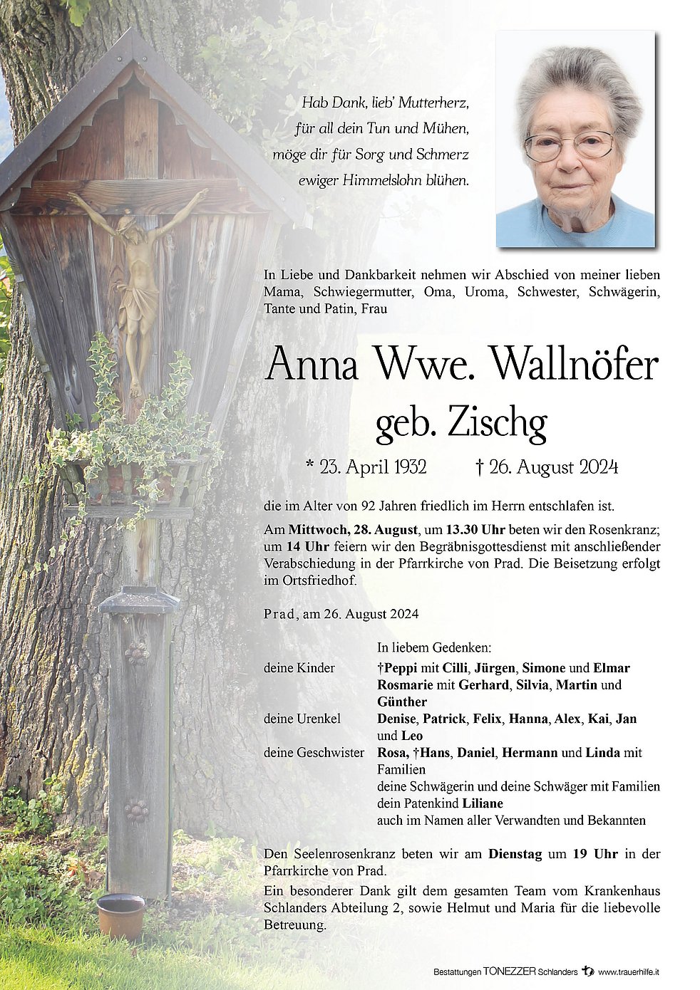 Begräbnisgottesdienst: 28.08. - 14:00 Uhr Pfarrkirche von Prad
