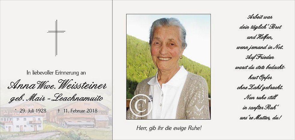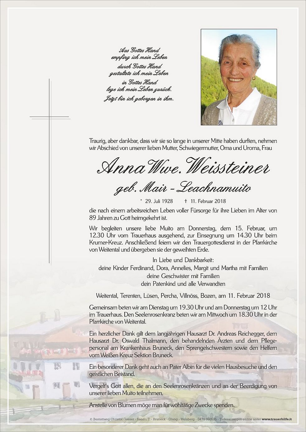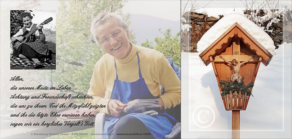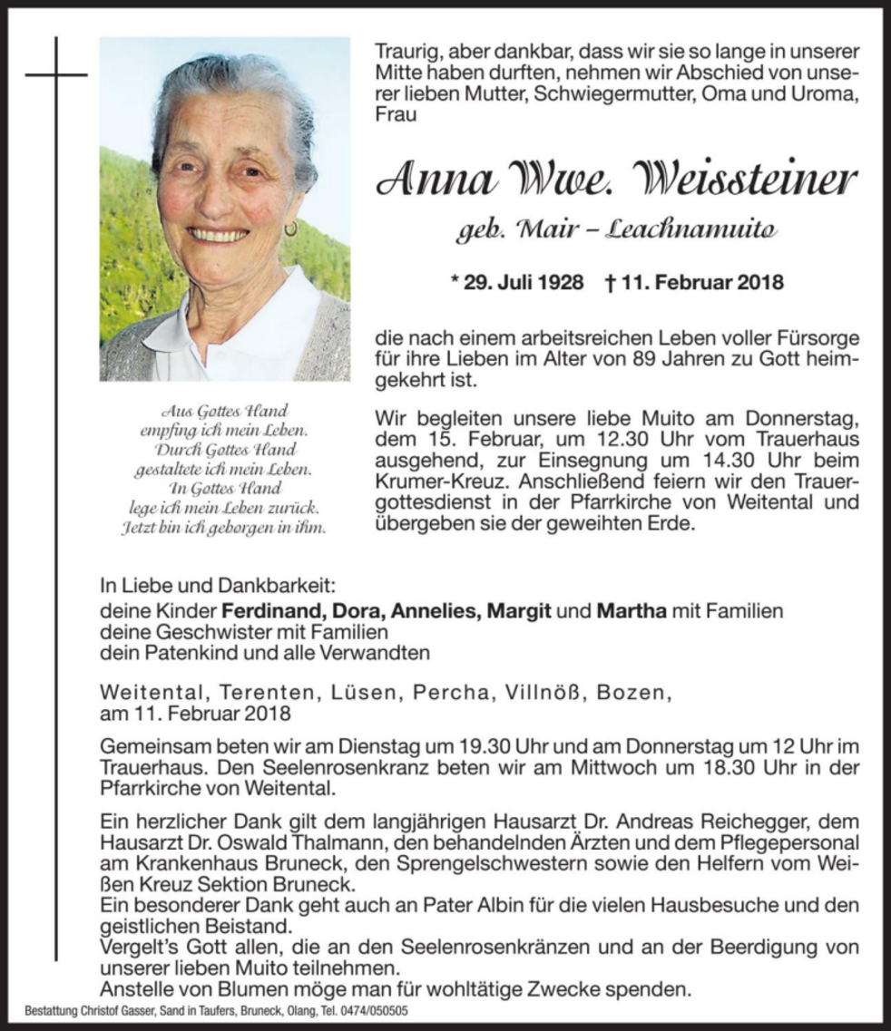 Ein herzlicher Dank gilt dem langjährigen Hausarzt Dr. Andreas Reichegger, dem Hausarzt Dr. Oswald Thalmann, den behandelnden Ärzten und dem Pflegepersonal am Krankenhaus Bruneck, den Sprengelschwestern sowie den Helfern vom Weißen Kreuz Sektion Bruneck.
