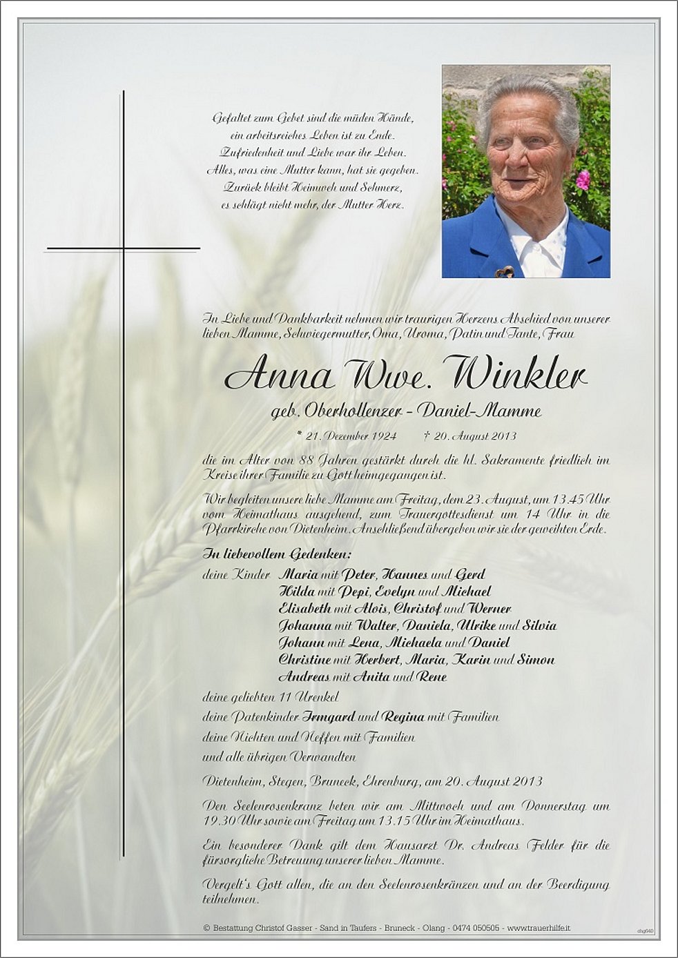 Wir begleiten unsere liebe Mamme am Freitag, dem 23. August, um 13.45 Uhr vom Heimathaus ausgehend, zum Trauergottesdienst um 14 Uhr in die Pfarrkirche von Dietenheim. Anschließend übergeben wir sie der geweihten Erde.
