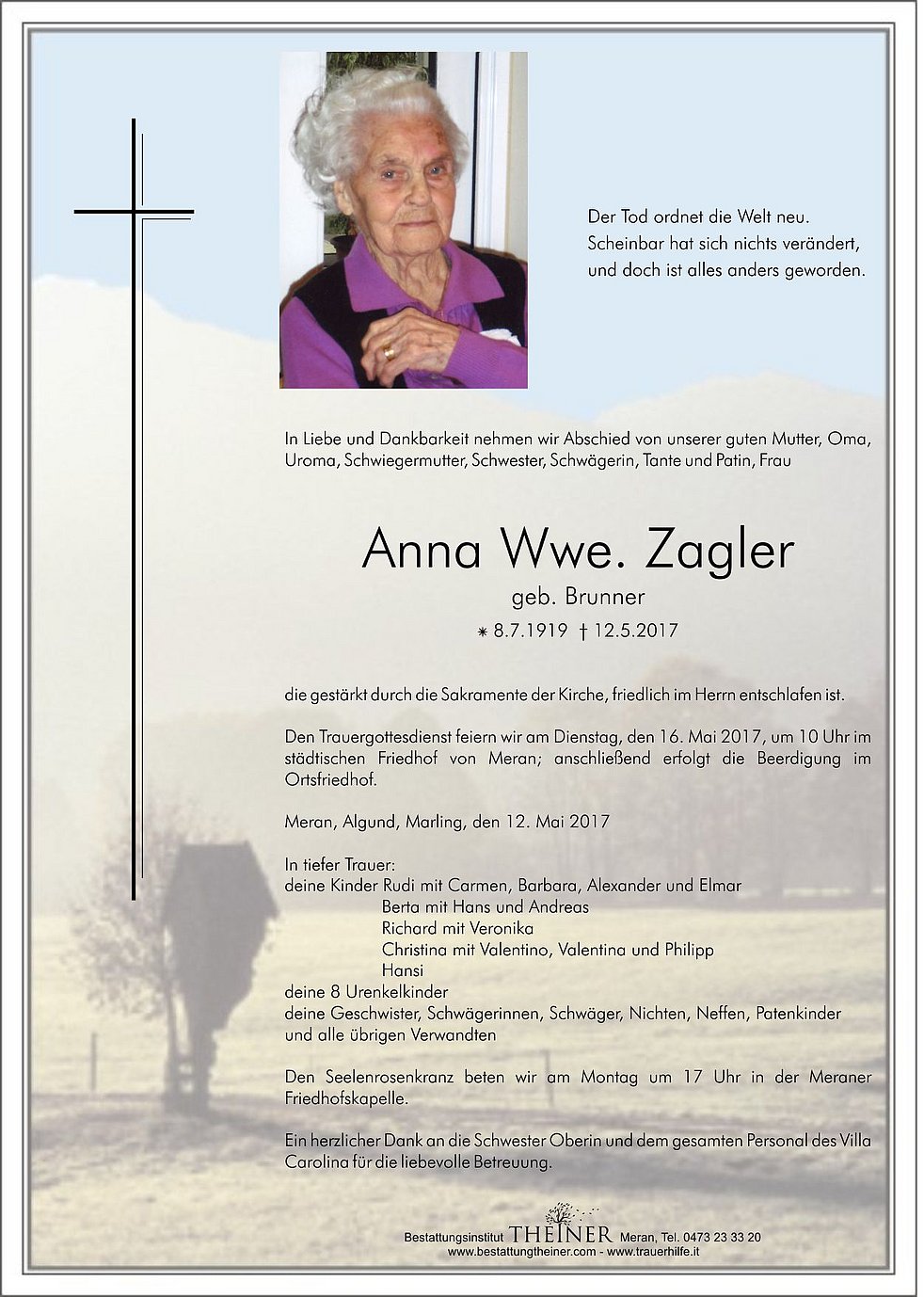Den Trauergottesdienst feiern wir am Dienstag, den 16. Mai 2017, um 10 Uhr im städtischen Friedhof von Meran; anschließend erfolgt die Beerdigung im Ortsfriedhof.