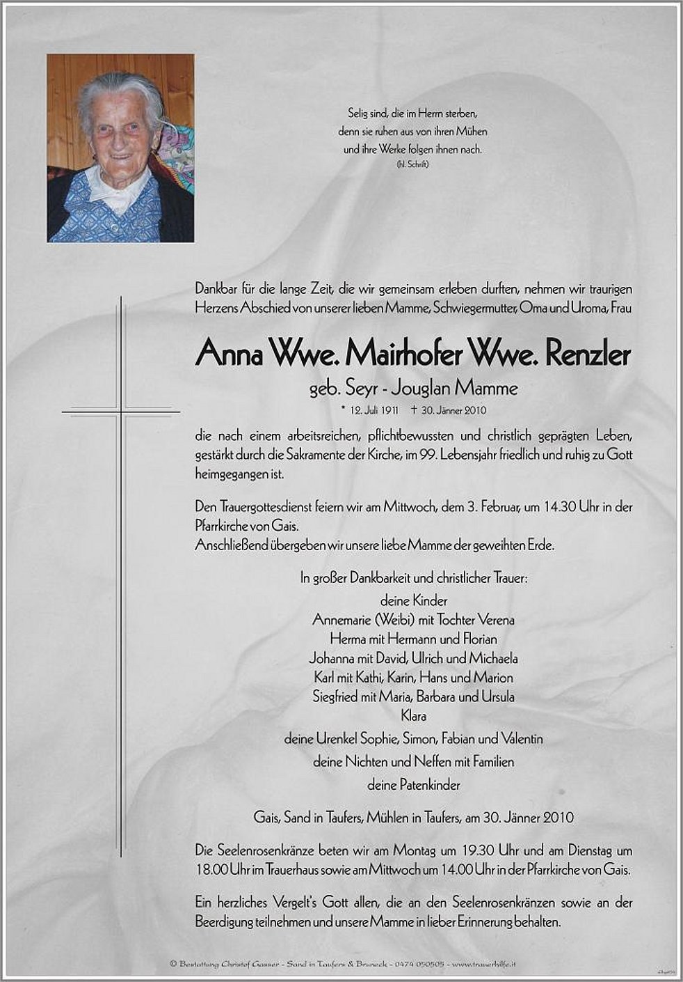 Anna Wwe. Mairhofer Wwe. Renzler geb. Seyr - Jouglan Mamme