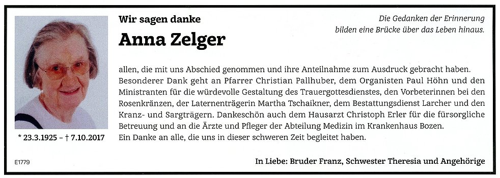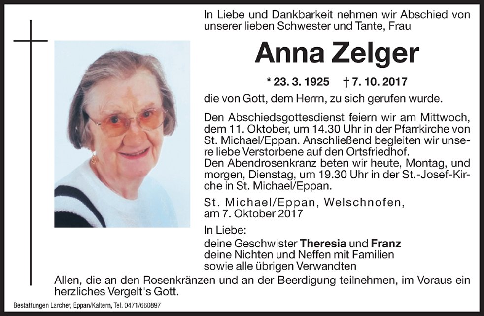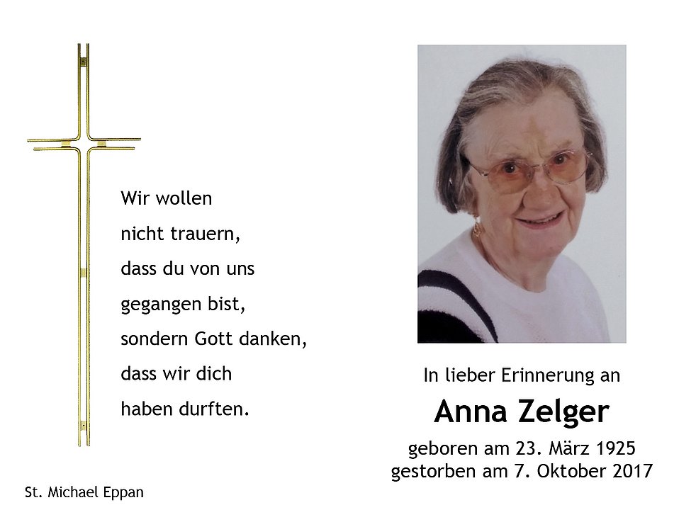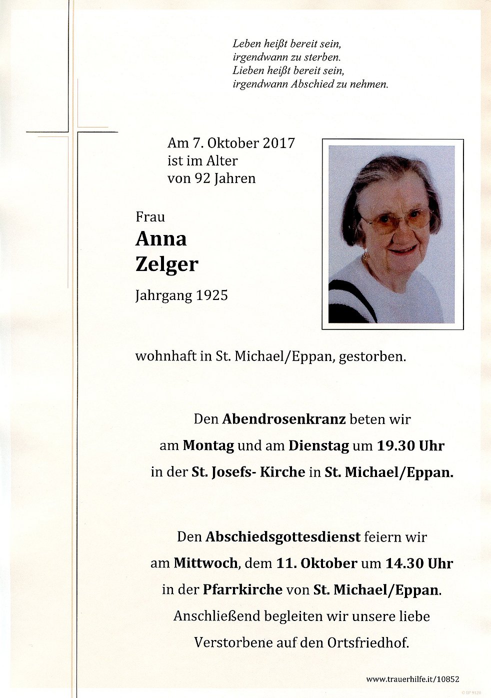Den Abschiedsgottesdienst feiern wir am Mittwoch, dem 11. Oktober um 14.30 Uhr in der Pfarrkirche von St. Michael/Eppan. Anschließend begleiten wir unsere liebe Verstorbene auf den Ortsfriedhof.