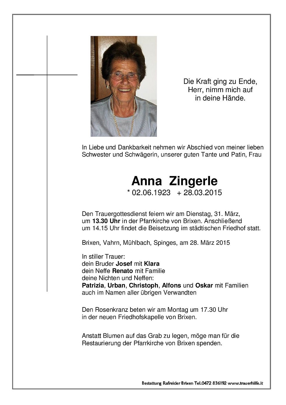 Anstatt Blumen auf das Grab zu legen, möge man für die Restaurierung der Pfarrkirche von Brixen spenden.