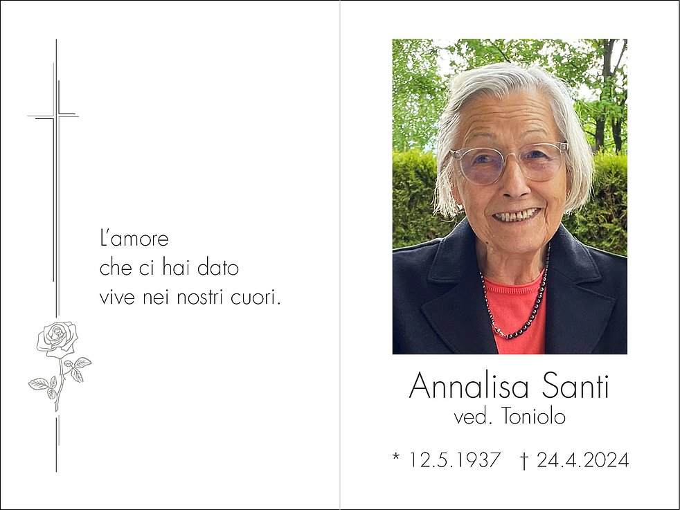 Ne danno il triste annuncio le figlie Paola, Cristina con Markus, Claudia con Maurizio, le amate nipoti Alice e Annika, i fratelli Mirella e Diego e parenti tutti.