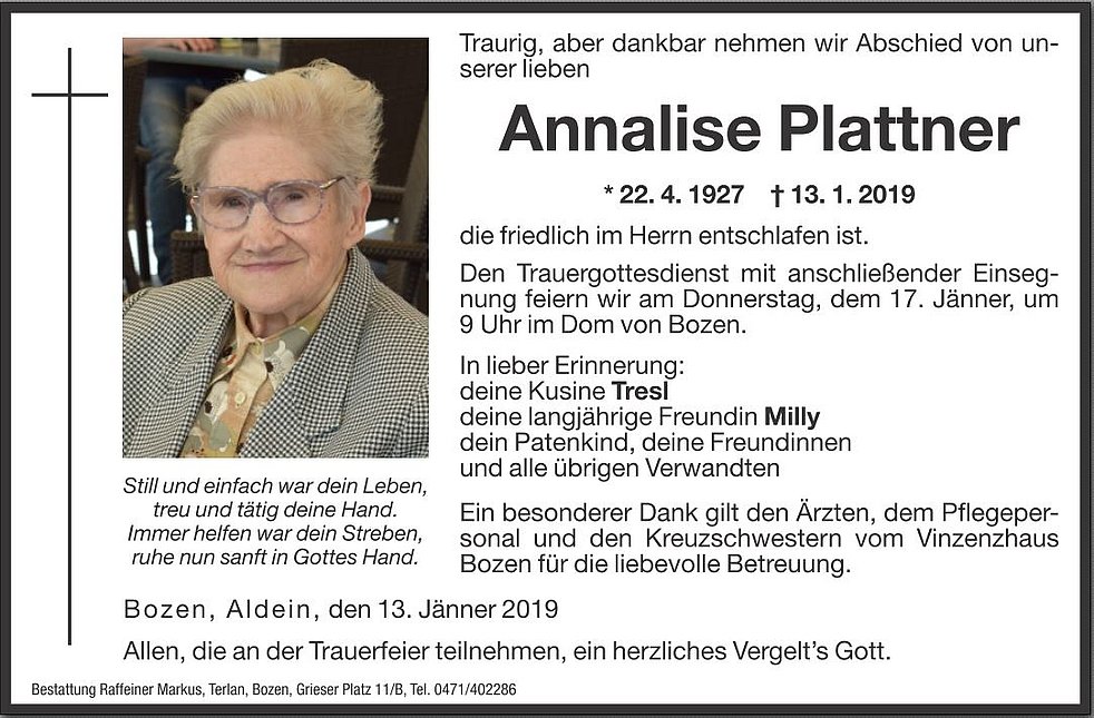 Ein besonderer Dank gilt den Ärzten, dem Pflegepersonal und den Kreuzschwestern vom Vinzenzhaus Bozen für die liebevolle Betreuung.