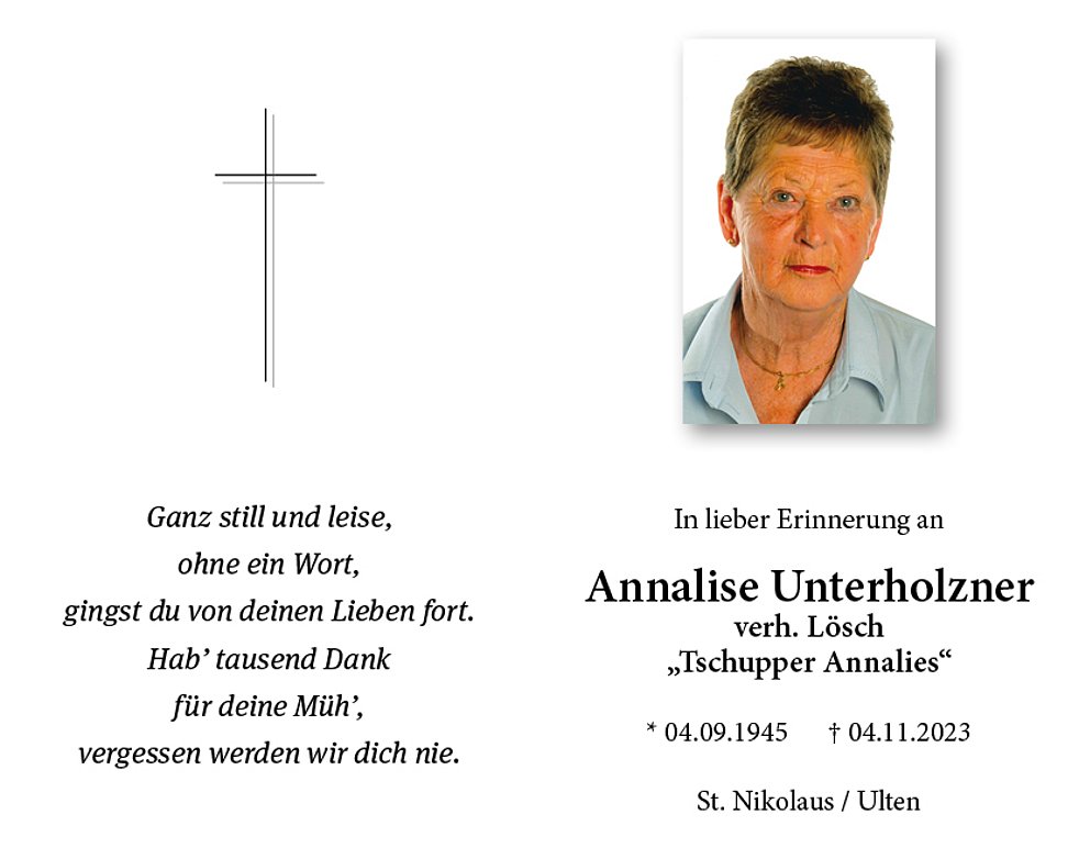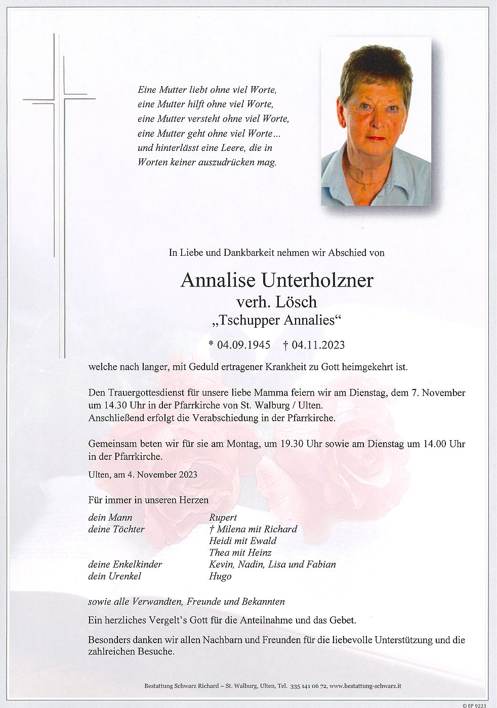 Den Trauergottesdienst für unsere liebe Mamma feiern wir am Dienstag, dem 7. November um 14.30 Uhr in der Pfarrkirche von St. Walburg / Ulten.