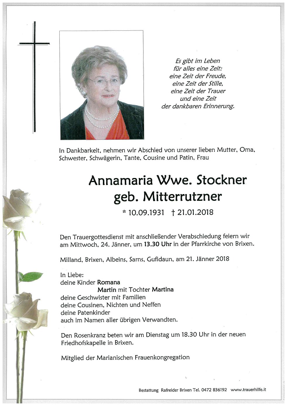 Gedankt sei dem Pflegepersonal des Hartmannsheim von Brixen für die liebevolle Betreuung sowie allen, die am Rosenkranz und an der Verabschiedung teilnehmen.