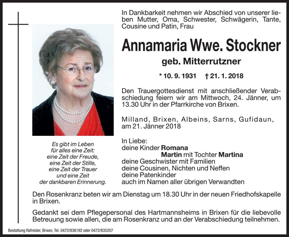Den Trauergottesdienst mit anschließender Verabschiedung feiern wir am Mittwoch, 24. Jänner, um 13.30 Uhr in der Pfarrkirche von Brixen.