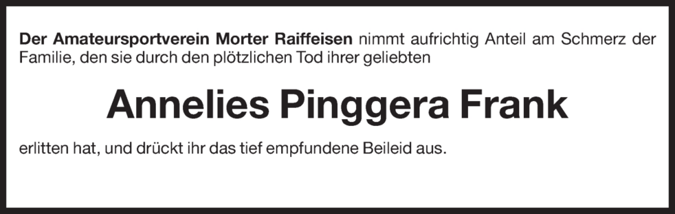 Wir drücken der Trauerfamilie unser aufrichtiges Mitgefühl und unser Beileid aus. Der plötzliche Tod macht uns betroffen, wir wünschen euch viel Kraft für die Zukunft. Ruhe in Frieden Annelies, das ewige Licht der ewigen Freude möge dir leuchten.