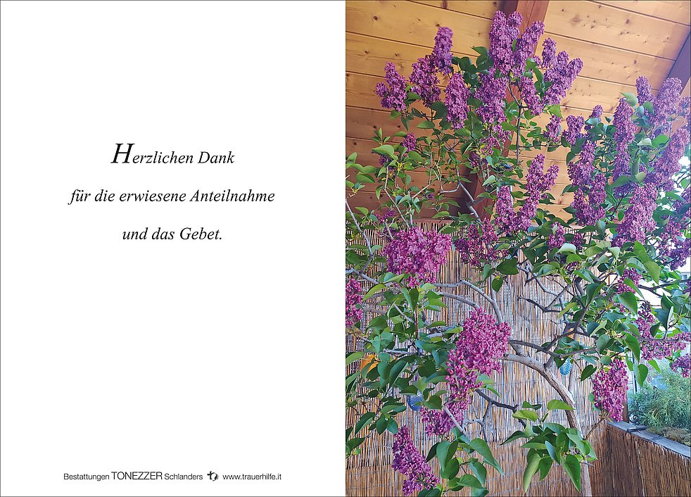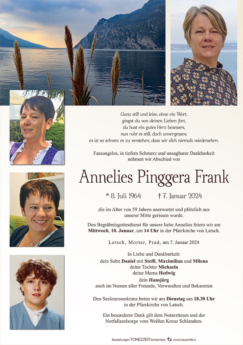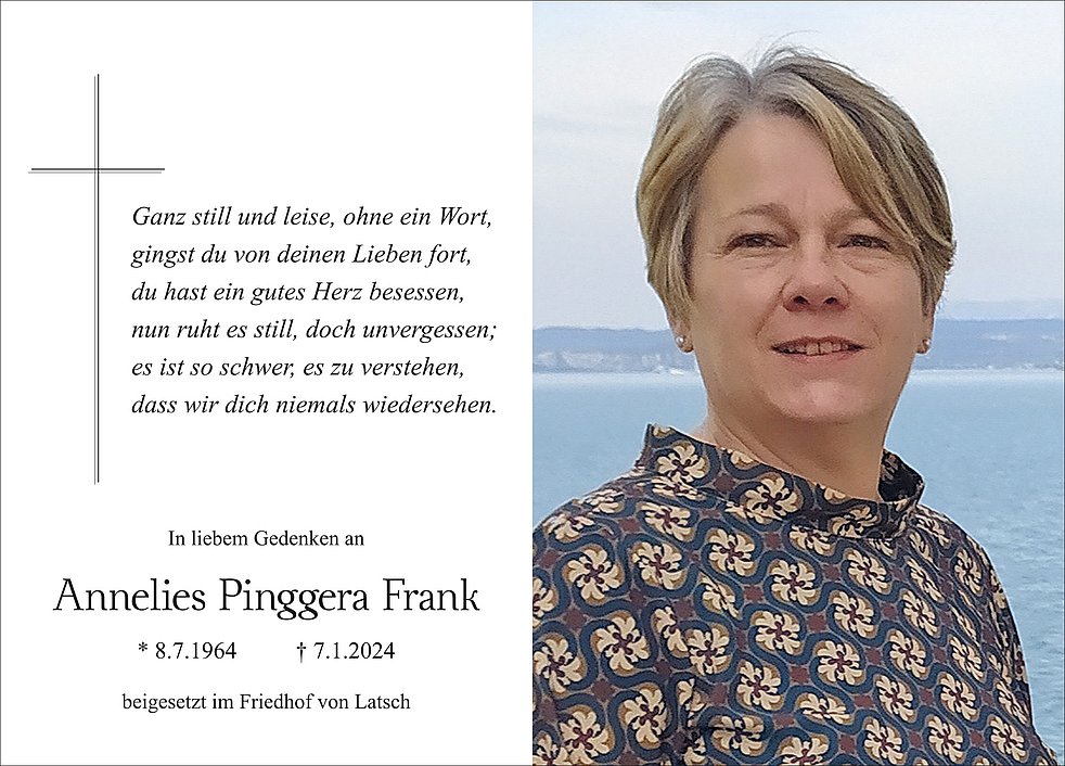 Liebe Annelies, atemlos und zutiefst traurig war ich als ich Deine Traueranzeige heute Morgen sah...Du bist Deinen Patienten in Deinem Beruf als Krankenschwester im Krankenhaus Schlanders mit Respekt und Würde begegnet, so auch mir und meiner Schwiegermutter...Danke Annelies...möge unser Gottvater Dir all Deine Liebe und Fürsorge die Du für uns Mitmenschen und Deine Familie hattest in Deiner neuen Heimat vergelten, Dir Liebe, Wärme und das ewige Licht schenken...werde Dich immer in guter Erinnerung behalten, unser letztes Gespräch, die Vorstellung wie Du liebevoll Dein Mammele oder Dein Enkelkind auf dem Weg ins Dorf begleitet hast...