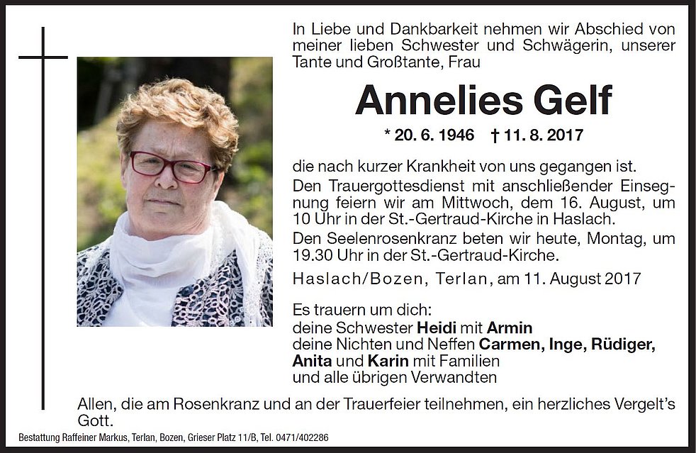 Den Trauergottesdienst mit anschließender Einsegnung feiern wir am Mittwoch, dem 16. August, um 10 Uhr in der St. Gertraud Kirche in Haslach.