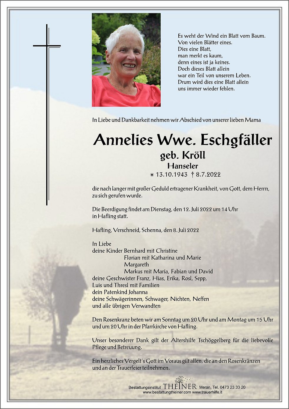 Die Beerdigung findet am Dienstag, den 12. Juli 2022 um 14 Uhr in Hafling statt.