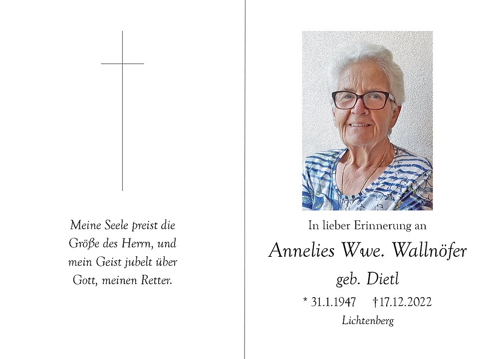 Am Dienstag, 20. Dezember, um 14 Uhr feiern wir den Begräbnisgottesdienst mit anschließender Verabschiedung in der Pfarrkirche von Lichtenberg.