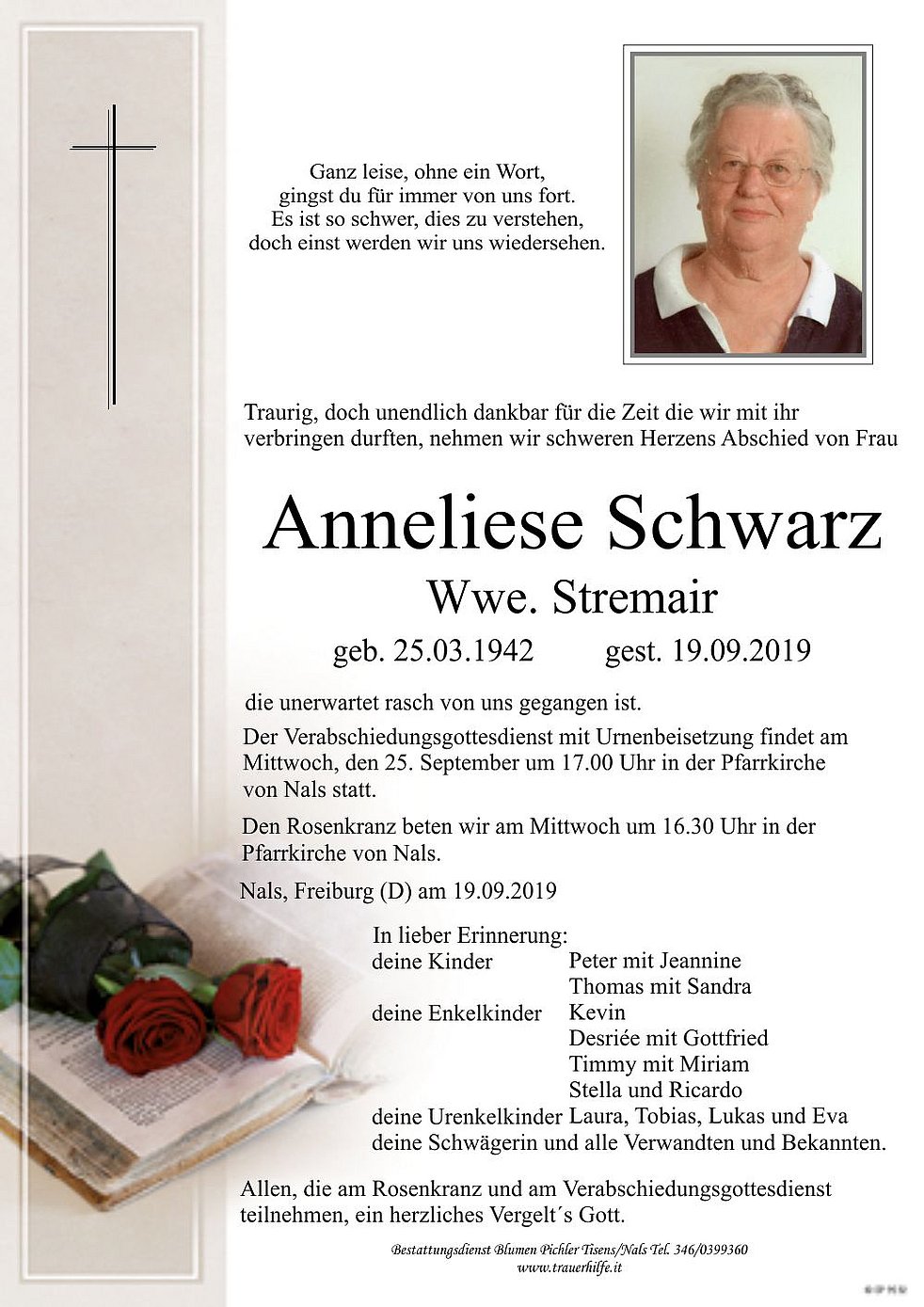 Ich möchte euch unsere Betroffenheit und unser Mitgefühl ausdrücken und wünsche euch viel Kraft für die Zukunft. Die Liebe Anneliese darf nun den lieben Gott ihr herzliches Lächeln schenken. Es ist mir eine Ehre so einen guten Menschen kennengelernt zu haben.