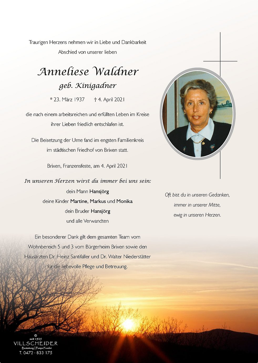 Liebe Fam. Waldner, mein aufrichtiges Beileid Euch Allen, mit Frau Waldner hat auch Brixen eine sehr liebevolle und kompetente Geschäftsfrau verloren! In ganz lieber Erinnerung wünsche ich Ihnen, Frau Anneliese, eine wunderbare Reise in eine traumhafte Welt und trauere mit der gesamten Familie, die alle eine wundervolle Frau verloren haben! Leben Sie für immer Wohl, Priska!