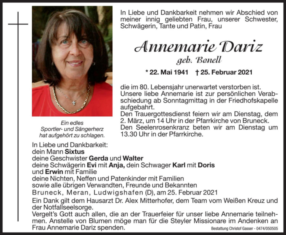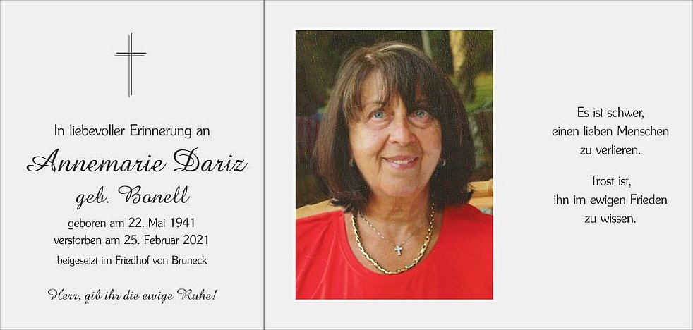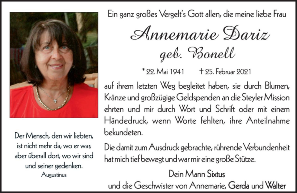 Anstelle von Blumen möge man für die Steyler Missionare im Andenken an Frau Annemarie Dariz spenden.