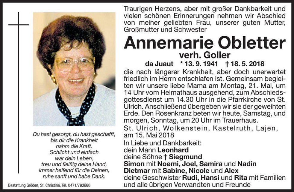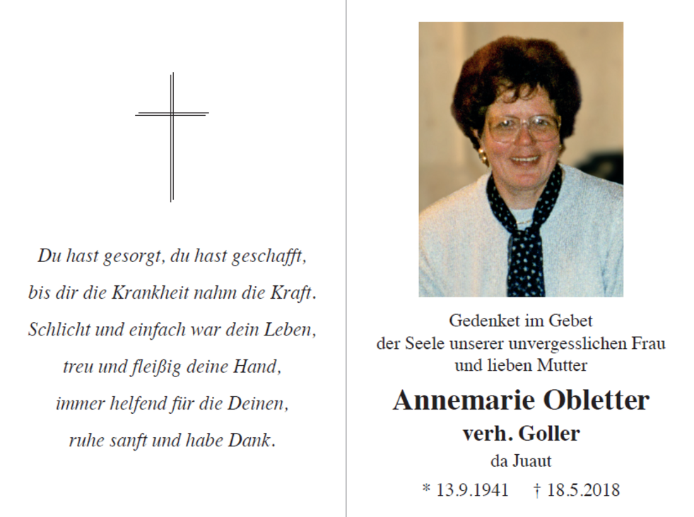Gemeinsam begleiten wir unsere liebe Mama am Montag, dem 21. Mai, um 14 Uhr vom Heimathaus ausgehend, zum Abschiedsgottesdienst um 14.30 Uhr in die Pfarrkirche von St. Ulrich. Anschließend übergeben wir sie der geweihten Erde.