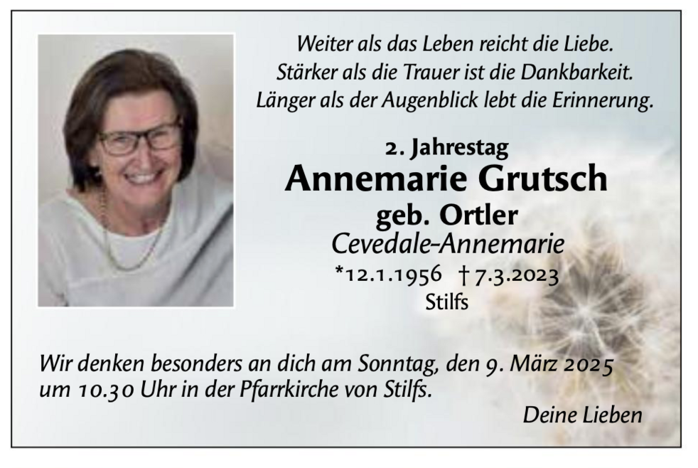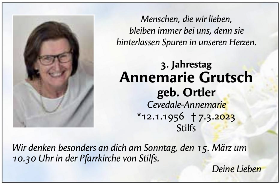 Am Freitag, 10. März, um 14 Uhr feiern wir den Begräbnisgottesdienst in der Pfarrkirche von Stilfs.
