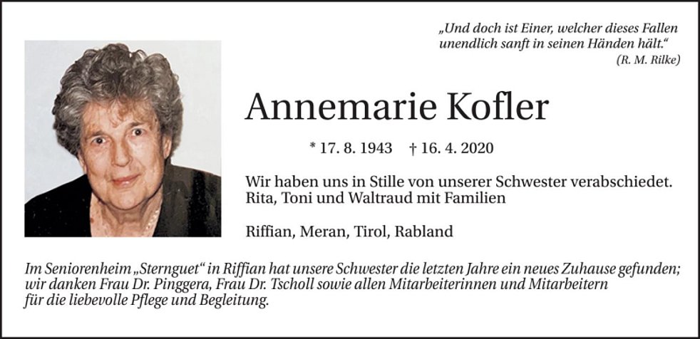 Ruhe in Frieden Annemarie, wir behalten dich in lieber Erinnerung