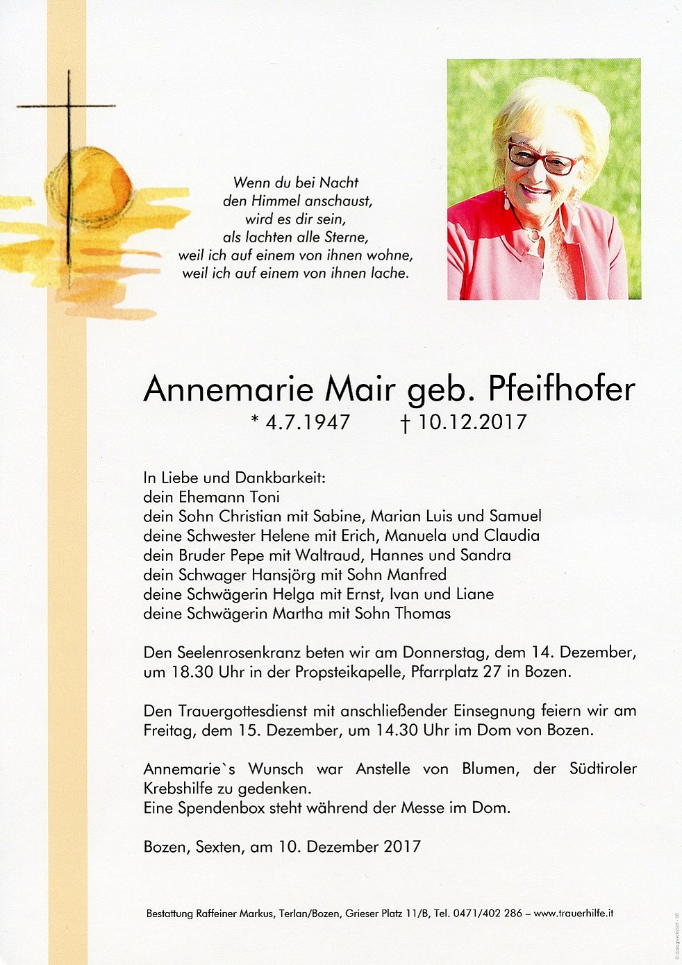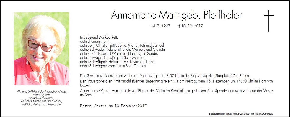 Annemarie`s Wunsch war anstelle von Blumen, der Südtiroler Krebshilfe zu gedenken. Eine Spendenbox steht während der Messe im Dom.