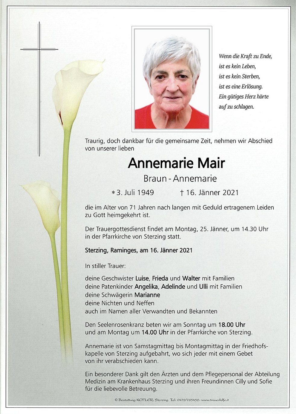 Annemarie ist von Samstagmittag bis Montagmittag in der Friedhofskapelle von Sterzing aufgebahrt, wo sich jeder mit einem Gebet von ihr verabschieden kann.