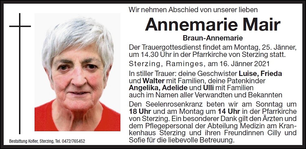 Der Trauergottesdienst findet am Montag, 25. Jänner, um 14.30 Uhr in der Pfarrkirche von Sterzing statt.