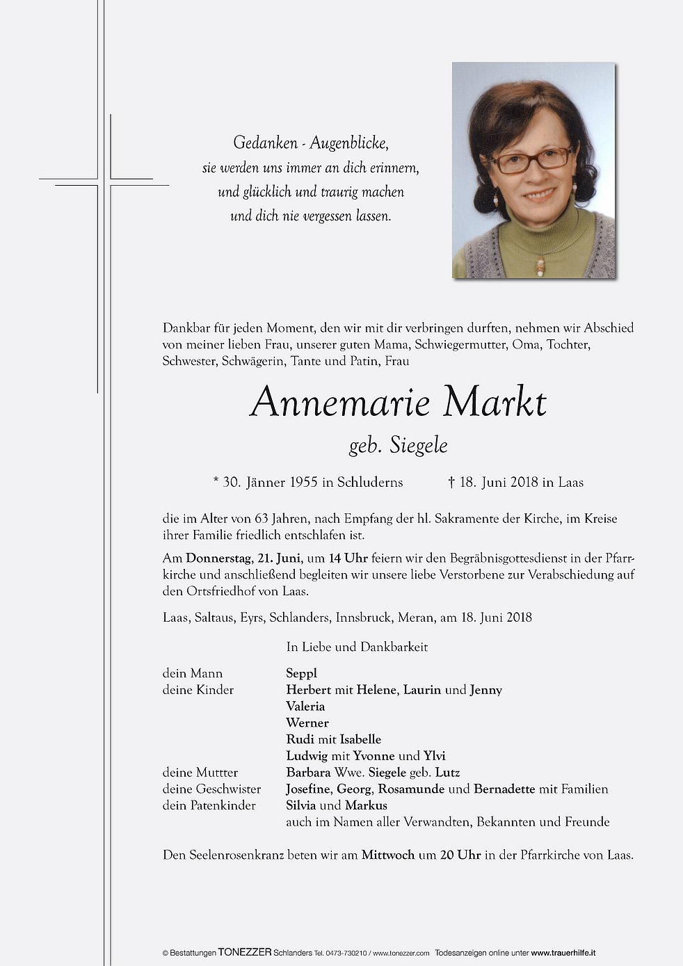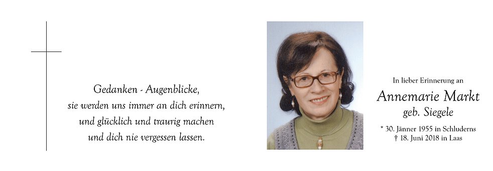 Am Donnerstag, 21. Juni, um 14 Uhr feiern wir den Begräbnisgottesdienst in der Pfarrkirche und anschließend begleiten wir unsere liebe Verstorbene zur Verabschiedung auf den Ortsfriedhof von Laas.